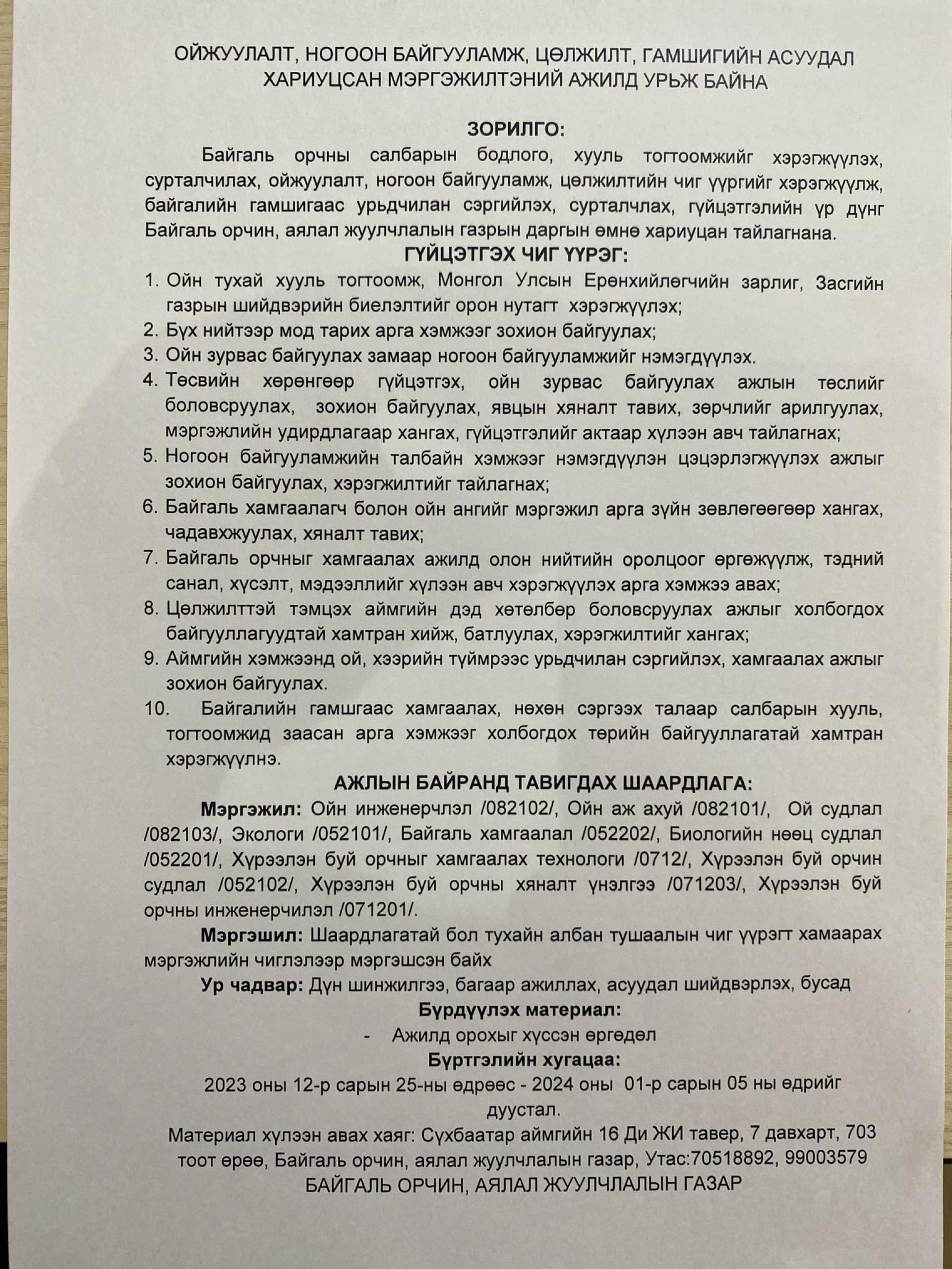АЖЛЫН БАЙРАНД ТАВИГДАХ ШААРДЛАГА: Мэргэжил: Ойн инженерчлэл /082102/, Ойн аж ахуй /082101/, Ой судлал /082103/, Экологи /052101/, Байгаль хамгаалал 1052202/, Биологийн нөөц судлал 1052201/, Хүрээлэн буй орчныг хамгаалах технологи 10712/, Хүрээлэн буй орчин судлал /052102/, Хүрээлэн буй орчны хяналт үнэлгээ /071203/, Хүрээлэн буй орчны инженерчилэл /071201/ Мэргэшил: Шаардлагатай бол тухайн албан тушаалын чиг үүрэгт хамаарах мэргэжлийн чиглэлээр мэргэшсэн байх