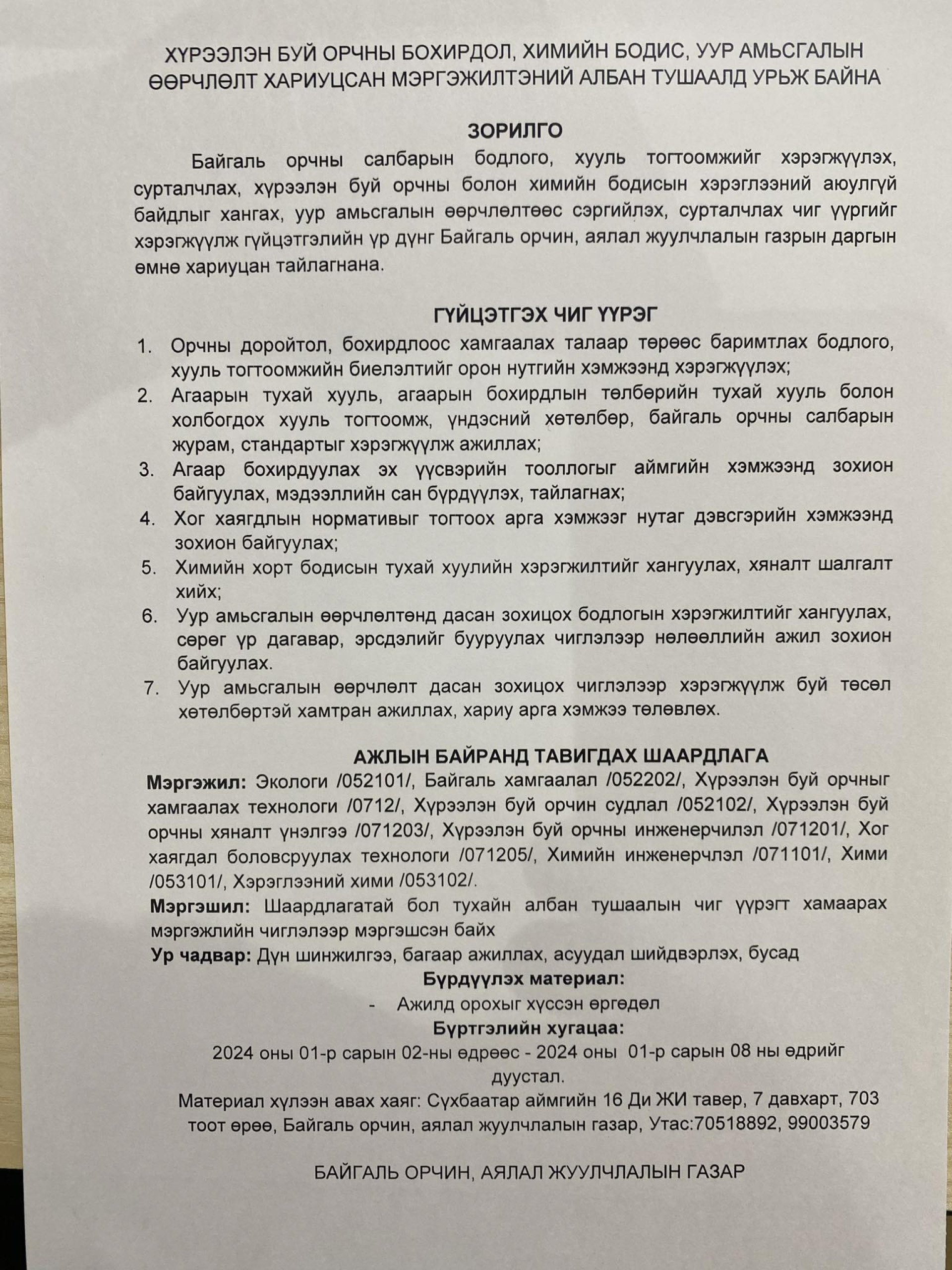 АЖЛЫН БАЙРАНД ТАВИГДАХ ШААРДЛАГА Мэргэжил: Экологи /052101/, Байгаль хамгаалал /052202/, Хүрээлэн буй орчныг хамгаалах технологи 10712/, Хүрээлэн буй орчин судлал /052102/, Хүрээлэн буй орчны хяналт үнэлгээ /071203/, Хүрээлэн буй орчны инженерчилэл /071201/, Хог хаягдал боловсруулах технологи /071205/, Химийн инженерчлэл /071101/, Хими 1053101/, Хэрэглээний хими /053102/. Мэргэшил: Шаардлагатай бол тухайн албан тушаалын чиг үүрэгт хамаарах мэргэжлийн чиглэлээр мэргэшсэн байх